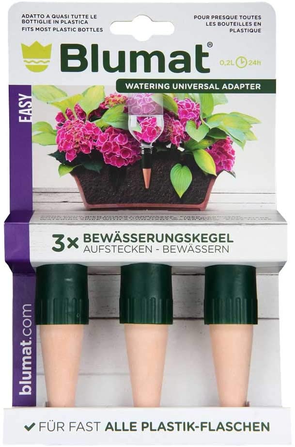 Blumat spikes are made of high-quality ceramic material, and they will keep your houseplants fresh for a long time (14 days approximately). The set-up is so fast and simple! Use any standard 1L or 2L bottle, cut or drill its bottom and screw it on the previously soaked stakes. The stakes should be in the water for 15 minutes before the setup.