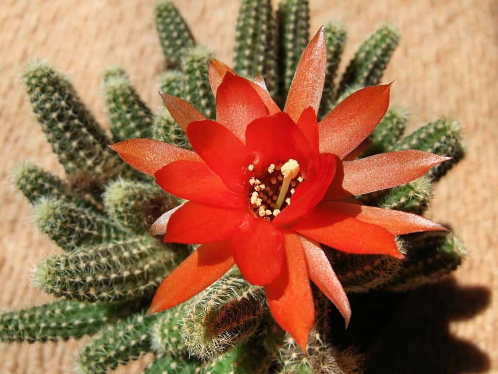This cactus variety forms clusters of finger-like, ribbed stems and soft spines. First, they grow upright but then trail, so they can be grown in a small hanging basket. Flushes of large, bright red flowers appear in spring and summer.