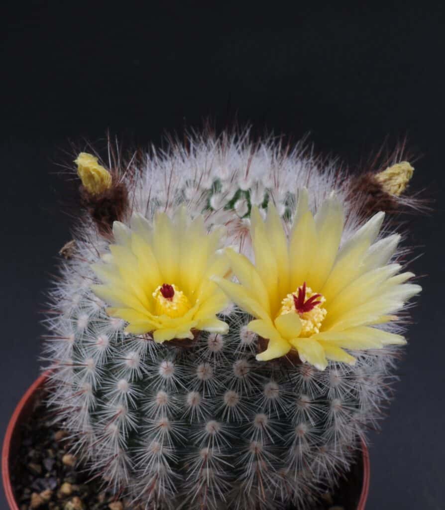 Also called Parodia scopa, this cactus has a beautiful round shape covered in fluffy white hair and spines that can be red or white. It grows faster than other Notocactus species, without releasing seedlings. It also forms an amazing flower at the top.