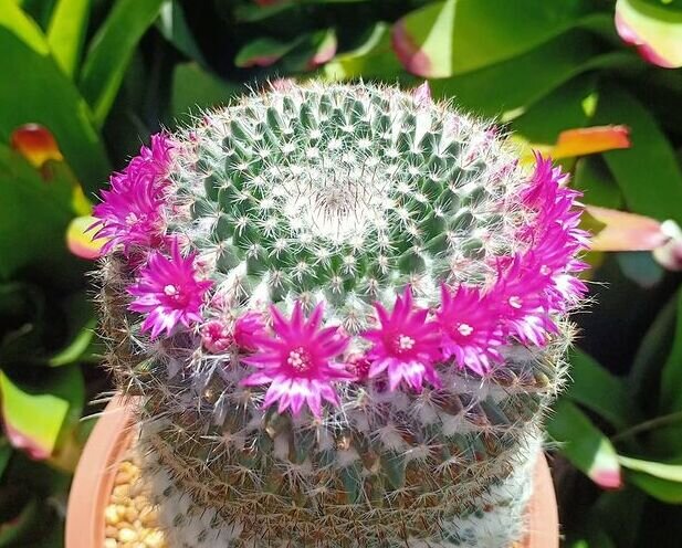 When in full bloom, this cactus has a ring of bright pink flowers around the top. It is very easy to grow and it thrives indoors with minimal care.