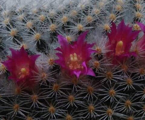 Pink Nymph forms a family of longer cacti, that’s why it is named so. It is a small clumping cactus, easy to grow and propagate, so it is great for beginners. Each one of them bears stunning pink flowers, especially in spring and fall. Mammillaria elongata var.albispina is another common type with its golden spines and small pale yellow flowers.