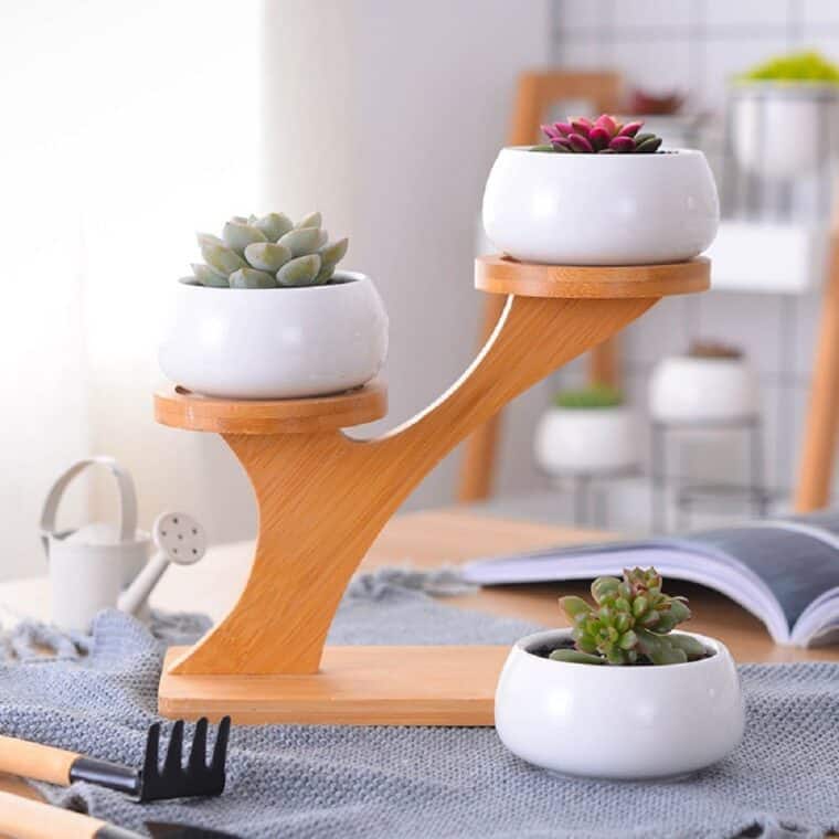 If you are looking for a perfect match of simplicity and practicality to adorn your home, this set is just the thing. With a stand made of bamboo and ceramic pots, this modern set makes a perfect home for the most beloved plants. Though highly elegant, this set is actually quite affordable. Sturdy and cute, they are easy to maintain and accommodate.