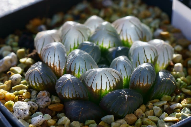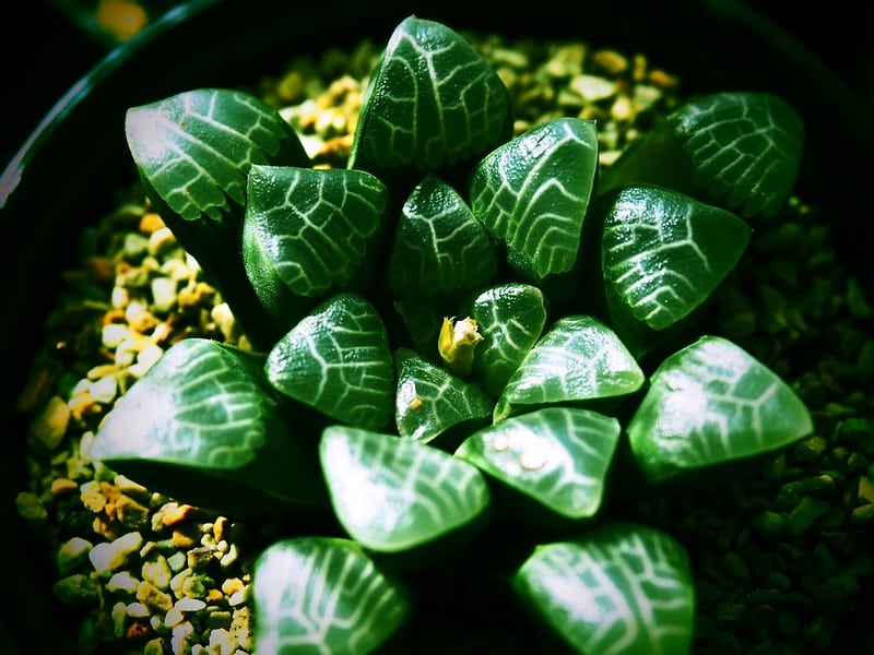 Haworthia retusa or the Star Cactus has pale green, almost translucent, fleshy leaves that are clumped together and resemble stars. These Haworthia types looks best when potted in a rectangular pot filled with tiny decorative stones.