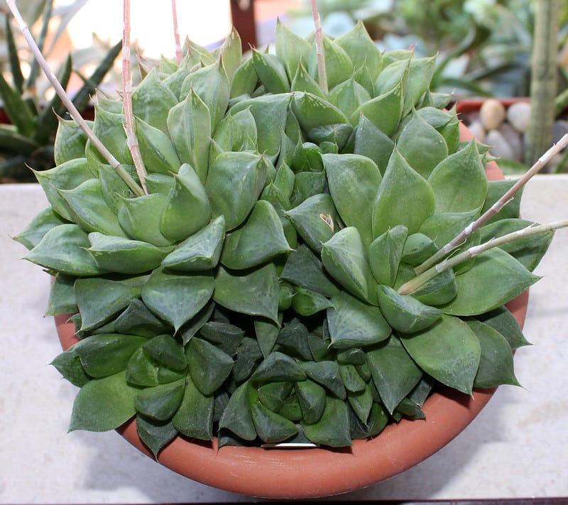 This variety is slightly different than other species. It is less spiky and less bold in terms of color. Rather, it is pale green, chunky, and short. The leaves are tightly packed together, forming a rosette. The top looks glossy and almost translucent. It is ideal for a shallow, decorative pot with stones on top.
