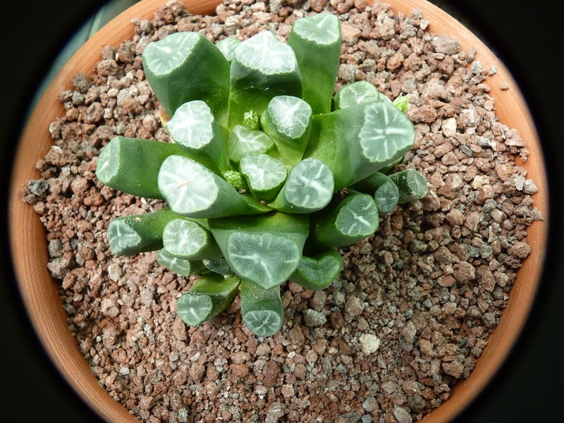 This is a miniature Haworthia species from South Africa. It grows virtually buried in the sand. It has fleshy, cylindrical leaves that lie at ground level with flat, blunt ends in green color. The leaves contain transparent water-holding tissue that allows the sun rays to penetrate inside the leaves. So they serve as “windows into the sand“. In that way, they can obtain nourishment even when they are hidden from the sun.