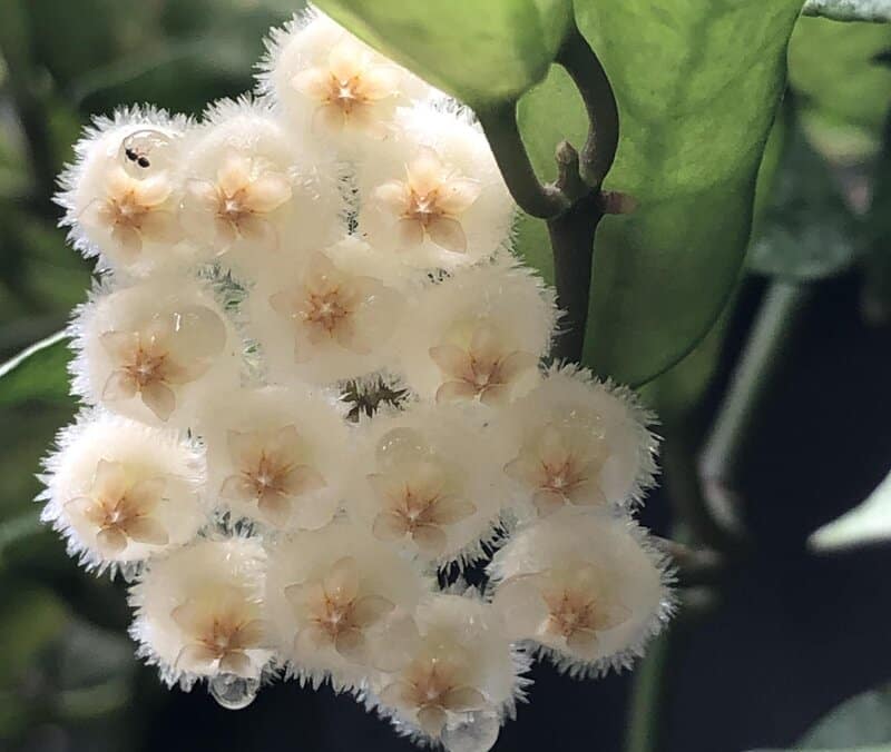 Hoya lacunosa is a species of the diverse Hoya genus with its miniature, fuzzy, pastel yellow flowers and glossy leaves. Each flower cluster is pendulous, looking downward, and comprises around 15-30 flowers each. Emerging from the center is a gorgeous, almost translucent, yellow-orange central crown.